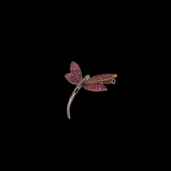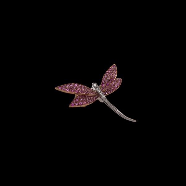 Diese außergewöhnliche Brosche in Form einer Libelle ist ein strahlendes Beispiel für die exquisite Handwerkskunst von Van Cleef & Arpels. Das renommierte Haus ist seit jeher für seine edlen, kunstvoll gefertigten Schmuckstücke bekannt, die Eleganz und zeitlose Schönheit vereinen. Diese exklusive Brosche ist in 18-karätigem Gold gefertigt und verbindet harmonisch Weiß- und Gelbgold. Der filigrane Körper der Libelle ist aus Weißgold gefertigt, während die eleganten, zart geschwungenen Flügel aus Gelbgold bestehen. Diese Farbkombination betont die natürliche Anmut und Lebendigkeit des Designs. In den Flügeln schimmern rosa Saphire während auf dem Körper zahlreiche Diamanten glitzern, die in meisterlicher Präzision eingefasst sind und das Licht auf unnachahmliche Weise einfangen.